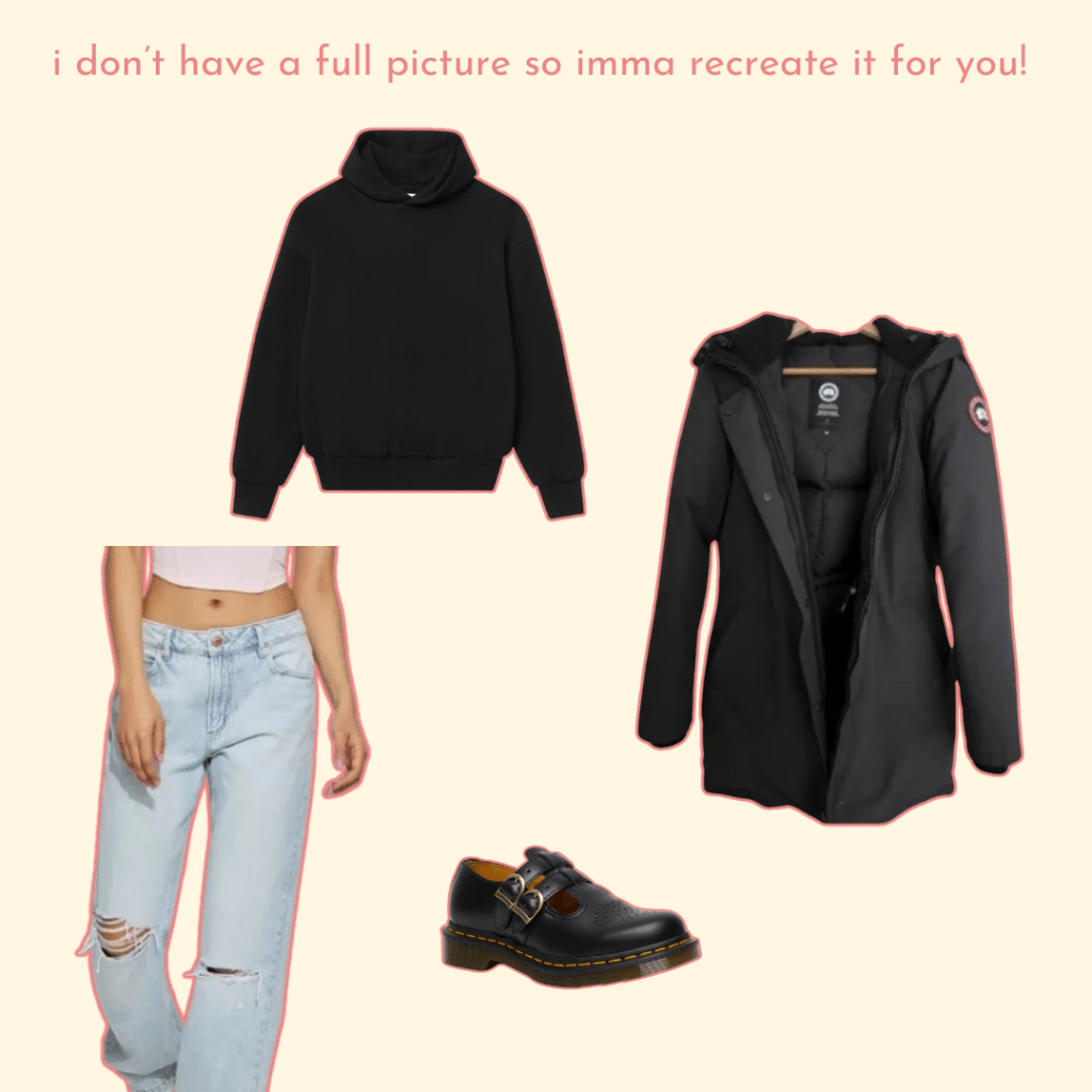 lazy funeral drip: hair was in a half up half down (essential to the fit), plain black sweatshirt, garage distressed slouchy light wash jeans with a thick single cuff, canada goose parka with hood removed, black glasses, and a black umbrella.