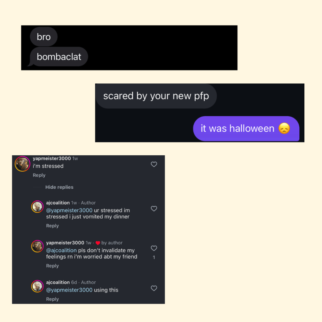 i have a best friend. who i absolutely adore. and i think the way we communicate to each other is rather interesting… we are close in the way siblings are close? i always used to say i wanted a twin brother when i was younger and i actually got one. like he goes over my parents house even when i’m not home just to hang out with them. like in high school he came over almost every night he was working. like das twin. we don’t really like to communicate the all the way because why would we. it’s like half a sentence majority of the time. and other times we just have funny conversations to lemme give you some examples from recently: